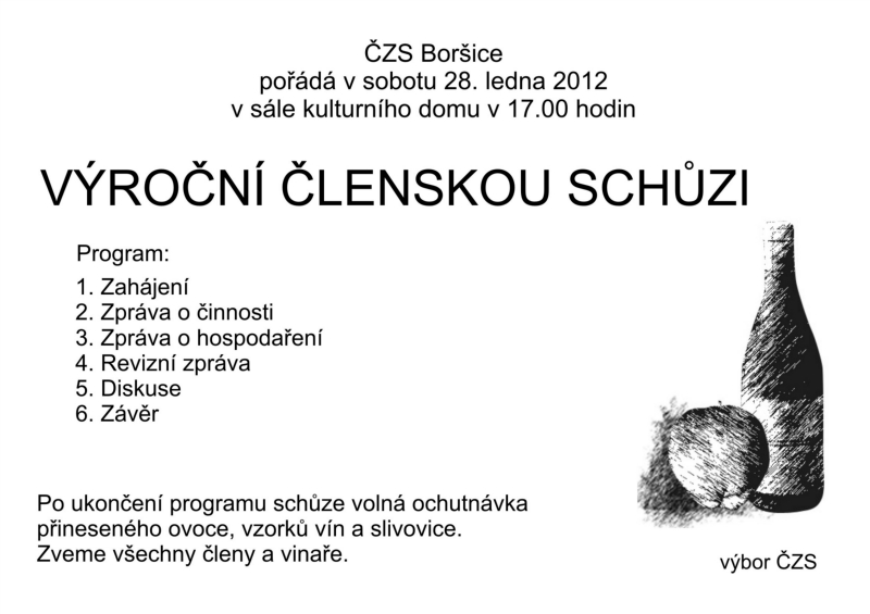 ČZS Boršice pořádá v sobotu 28. ledna 2012v sále kulturního domu v 17.00 hodin VÝROČNÍ ČLENSKOU SCHŮZI.
