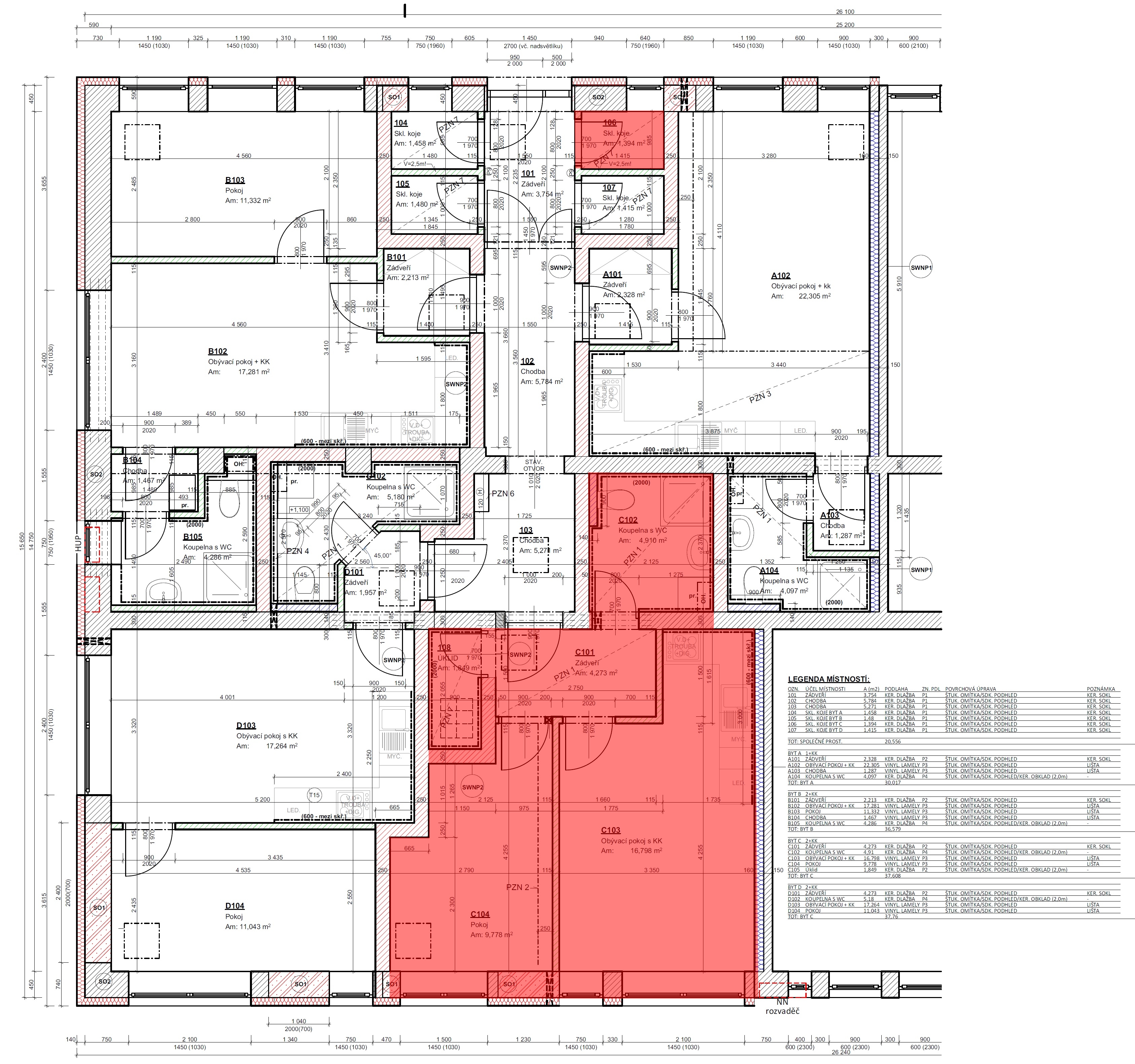 ZÁDVEŘÍ 2,328 m2, OBÝVACÍ POKOJ + KK 22,305 m2, CHODBA 1,287 m2, KOUPELNA S WC 4,097 m2